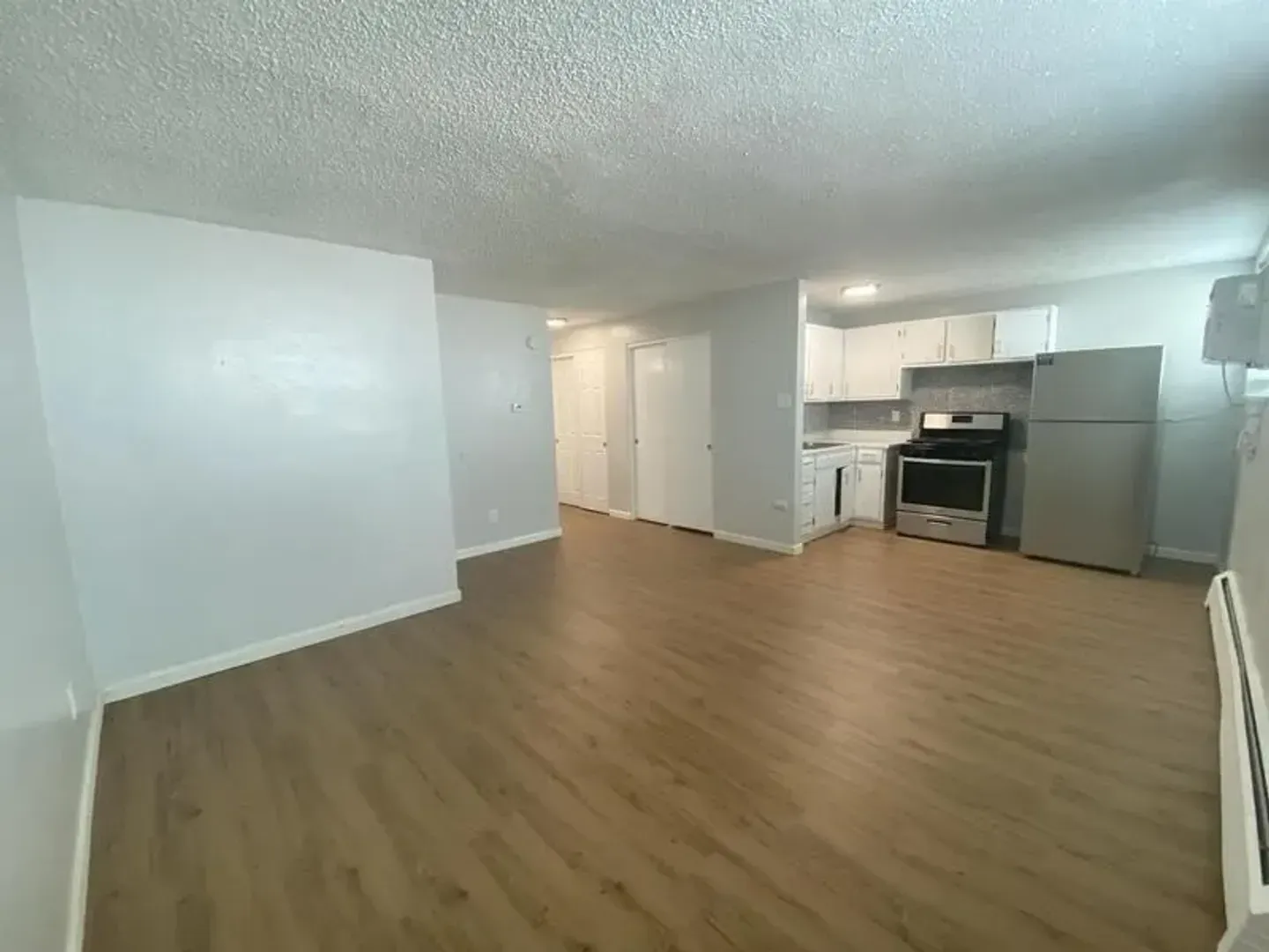 Modern finishes throughout: hardwood (or vinyl wood‑look) flooring, stainless steel kitchen appliances, ceiling fans, generous cabinet space.